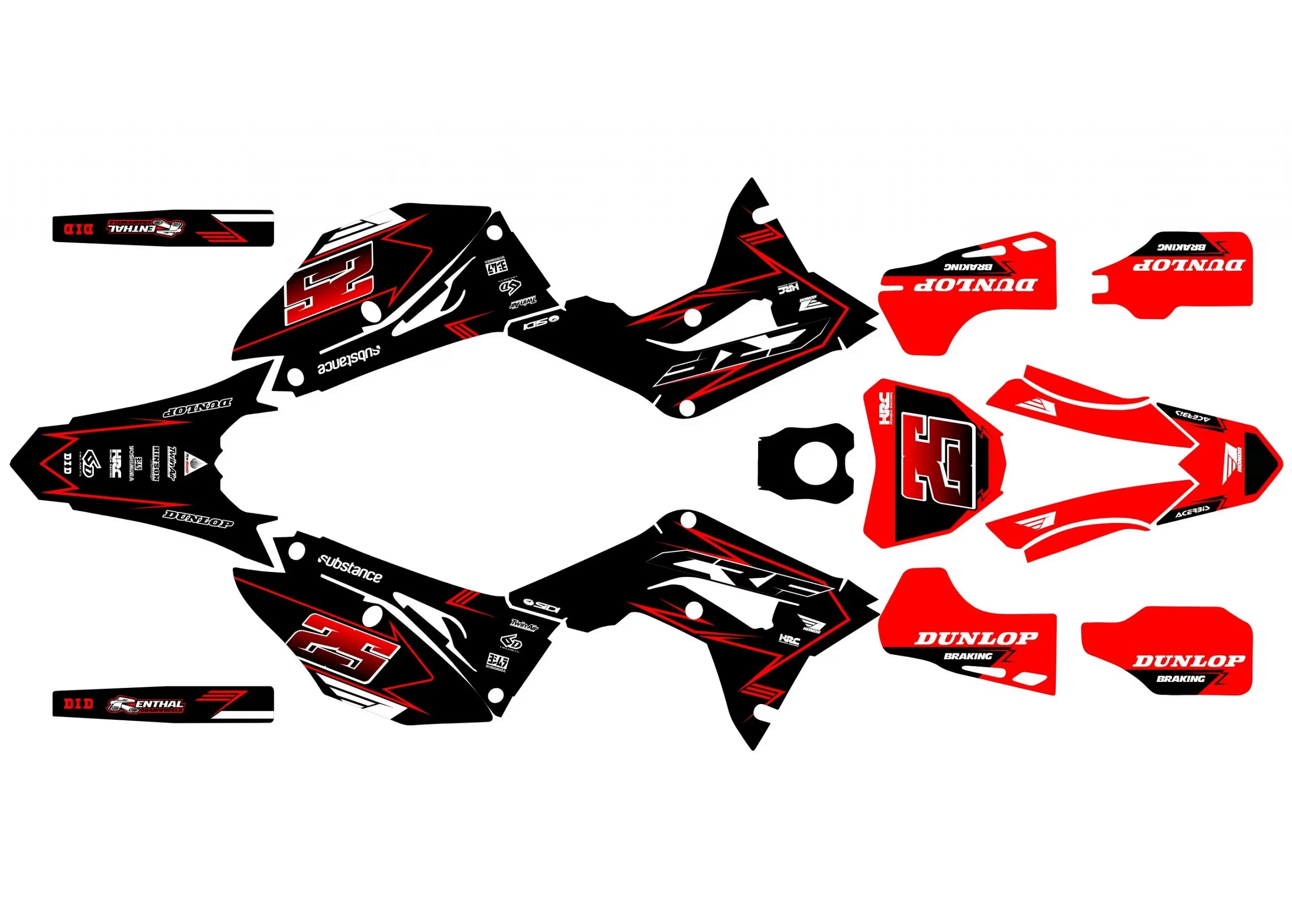 Pour une personnalisation encore plus poussée, vous pouvez customiser votre Kit déco Honda 250 CRF (2018-2021) – Factory avec nos différentes options comme la base du Kit déco, la finition et pourquoi pas ajouter votre pseudo ou bien changer le numéro.