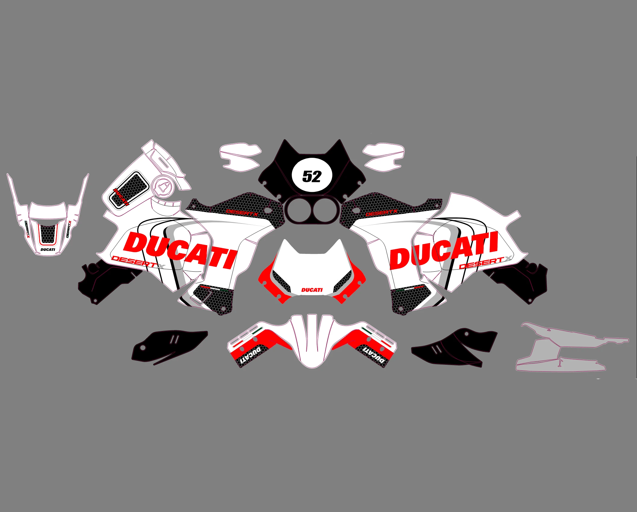Pour une personnalisation encore plus poussée, vous pouvez customiser votre Kit déco Ducati Desert X – Type Origine avec nos différentes options comme la base du Kit déco, la finition et pourquoi pas ajouter votre pseudo ou bien changer le numéro.