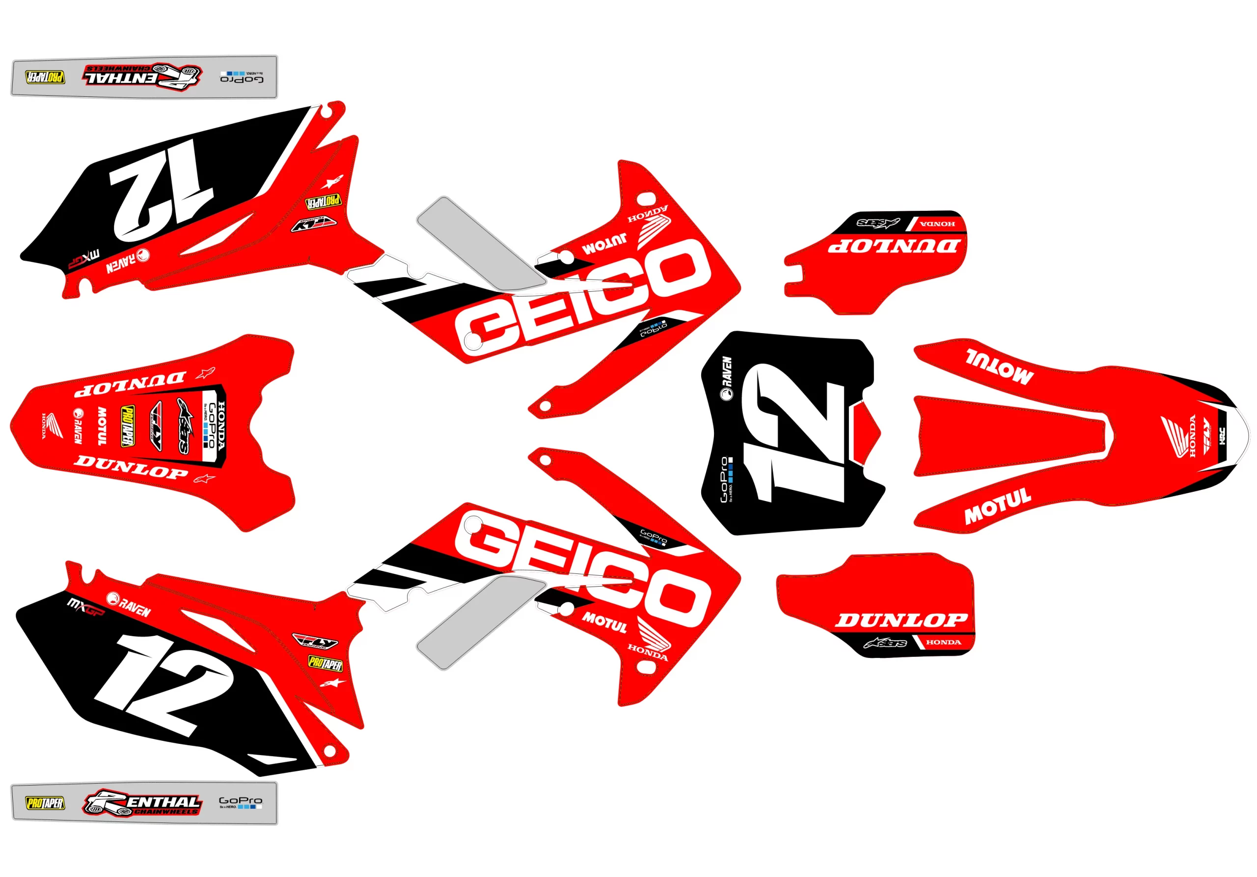 Pour une personnalisation encore plus poussée, vous pouvez customiser votre Kit déco Honda 450 CRF (2009-2012) – Answer avec nos différentes options comme la base du Kit déco, la finition et pourquoi pas ajouter votre pseudo ou bien changer le numéro.