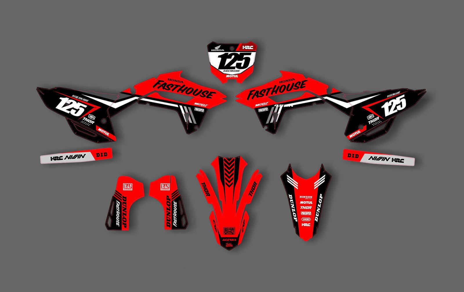 Pour une personnalisation encore plus poussée, vous pouvez customiser votre Kit déco Honda 450 CRF (2021-2024) – Fasthouse avec nos différentes options comme la base du Kit déco, la finition et pourquoi pas ajouter votre pseudo ou bien changer le numéro.