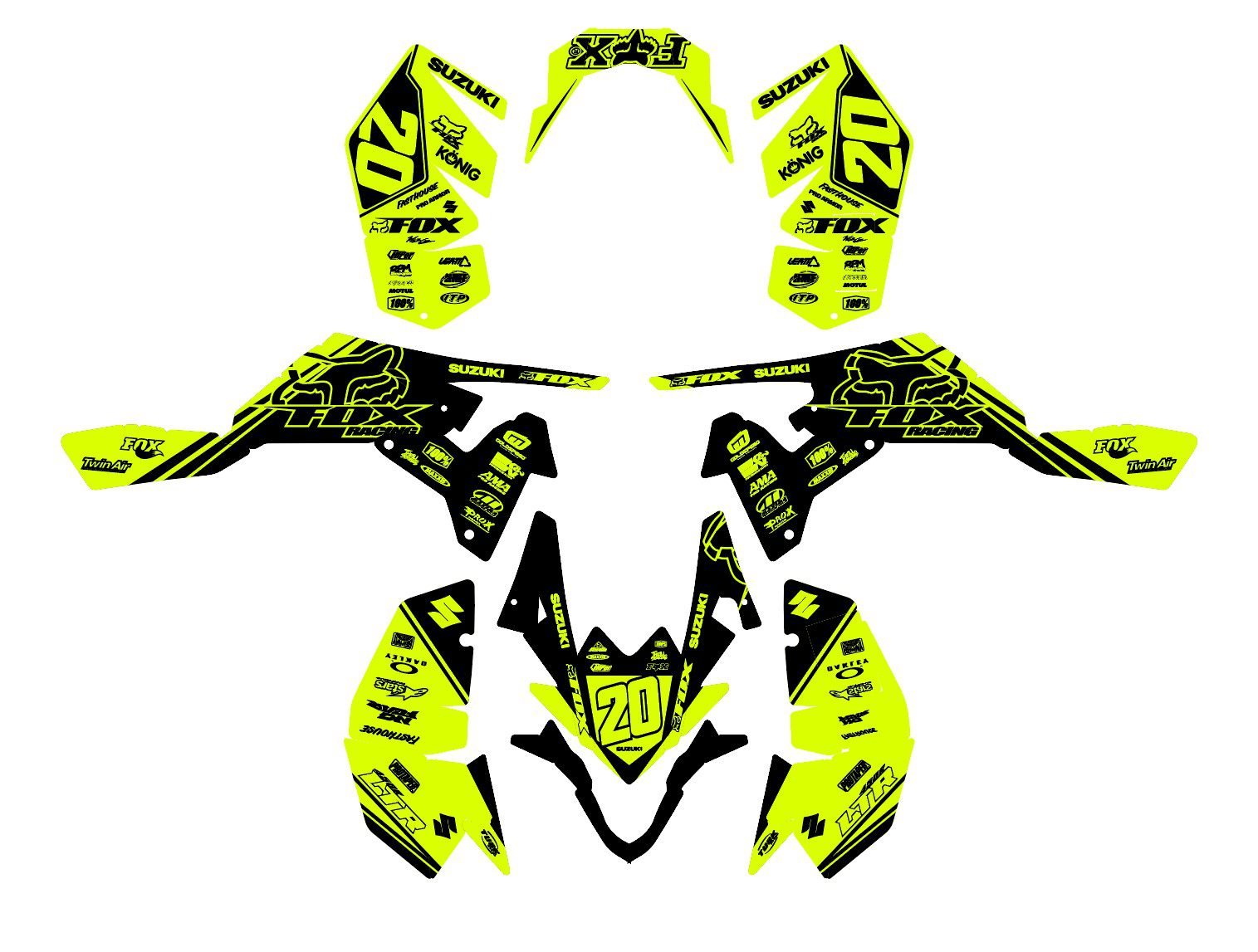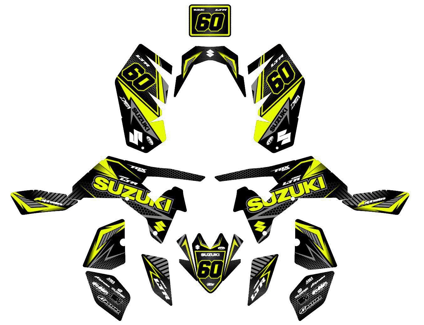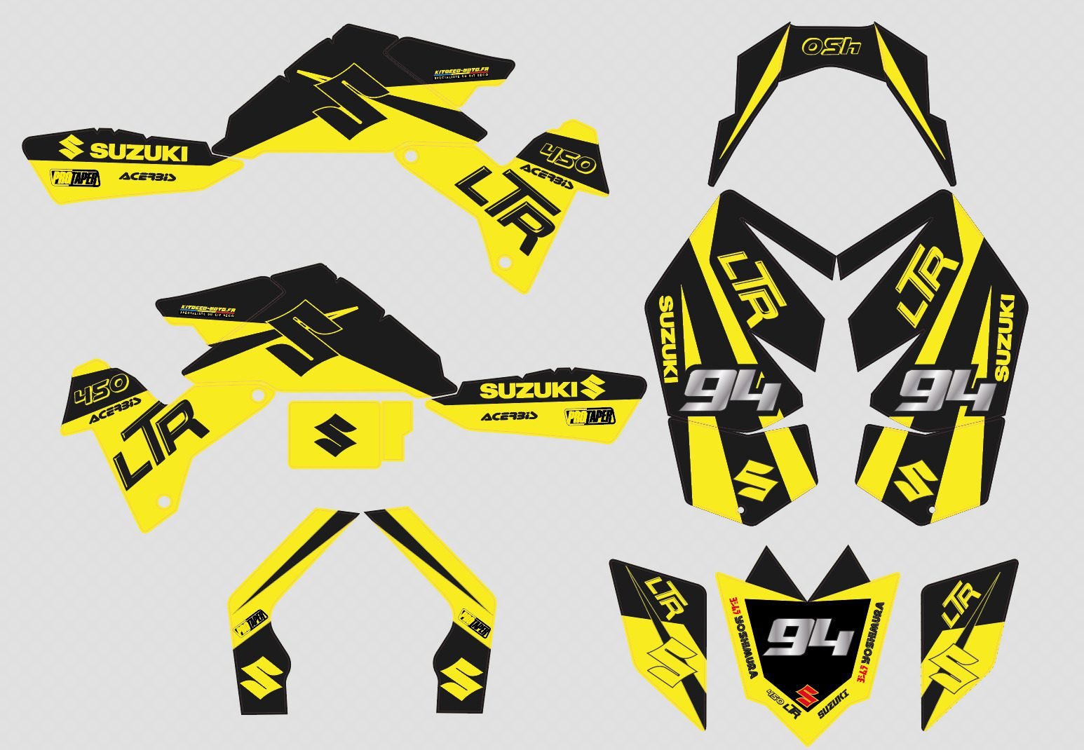 Pour une personnalisation encore plus poussée, vous pouvez customiser votre Kit déco Suzuki LTR 450 – Racing Jaune avec nos différentes options comme la base du Kit déco, la finition et pourquoi pas ajouter votre pseudo ou bien changer le numéro.