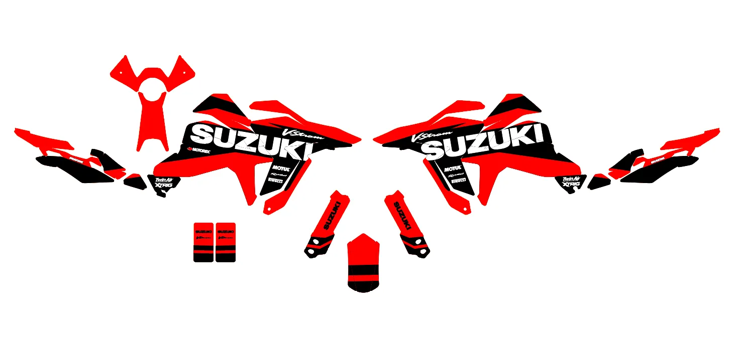 Pour une personnalisation encore plus poussée, vous pouvez customiser votre Kit déco Suzuki V-Strom 800 DE – Factory Rouge avec nos différentes options comme la base du Kit déco, la finition et pourquoi pas ajouter votre pseudo ou bien changer le numéro.